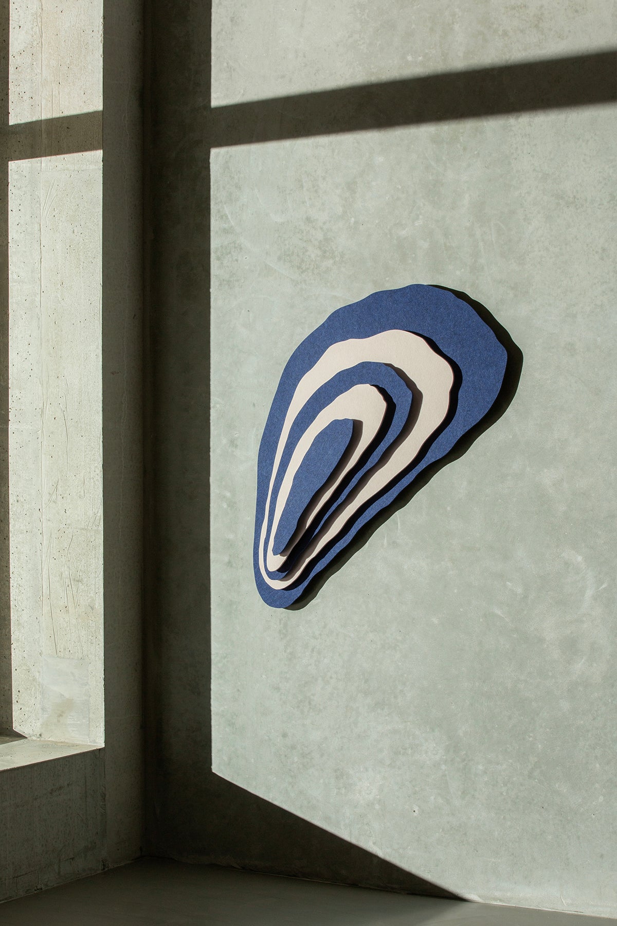 Fritskåret silhuet af en østers i to farver, håndlavet af upcycled filt.
